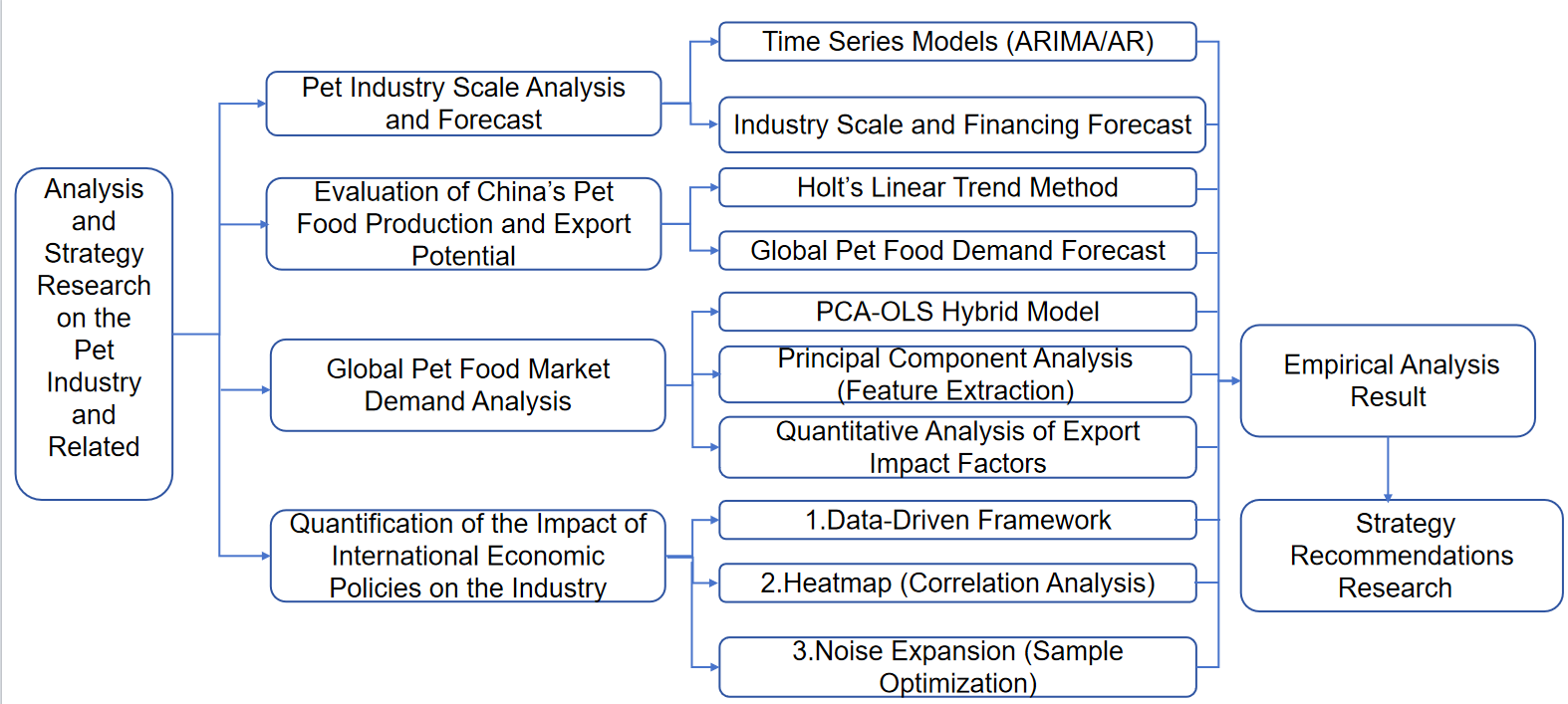 Driven by consumption upgrading and sustained economic growth, the global pet industry has expanded rapidly. As a representative emerging market, China's pet economy has exceeded RMB 500 billion in scale; however, it faces challenges such as intensifying market competition, low export dependence, and fluctuations in international policies. This study employs a combination of the ARIMA time series model, Holt's linear trend method, Principal Component Analysis (PCA), and Ordinary Least Squares (OLS) regression to systematically examine the development trends of China's pet industry, the structural differentiation of the global pet food market, and China's production capacity and export potential in pet food. The findings indicate that China's pet industry is transitioning from a phase of rapid growth to a more mature stage characterized by moderated expansion. Over the next three years, the market size is projected to grow at an average annual rate of 10.5%, with the focus of competition shifting toward product differentiation and service upgrading. Global demand for pet food exhibits pronounced regional disparities: the U.S. market is approaching saturation, the European market maintains a competitive advantage in quality and safety, and emerging markets such as China are becoming the primary engines of growth. Although China's pet food production reached RMB 270.3 billion in 2023, exports accounted for less than 2%, highlighting a structural imbalance characterized by demand-driven domestic consumption and relatively weak international competitiveness. PCA results reveal that trade barriers and production costs are the primary factors constraining exports. Based on these quantitative findings, this study proposes strategies including short-term optimization of supply chain costs, long-term expansion into high-potential markets in Southeast Asia and Latin America, and the strengthening of digital marketing capabilities. These recommendations aim to provide data-driven decision support for the sustainable development of the industry and the enhancement of firms' international competitiveness.