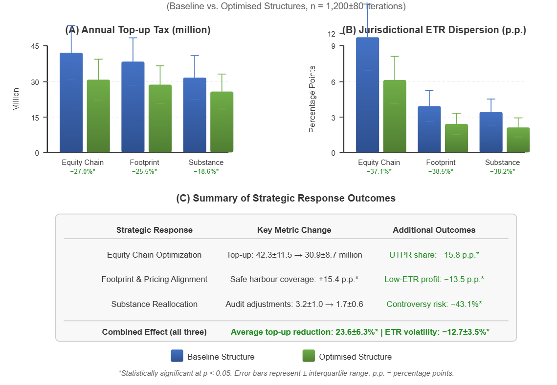 This paper develops an operating blueprint for multinational enterprises facing the 15% global minimum tax under Pillar Two. It combines structured analysis of implementation status, Qualified Domestic Minimum Top-up Taxes (QDMTTs), and safe harbours with quantitative assessment of strategic responses across equity chains, business footprint, and substance. A comparative mapping of 48 ± 3 jurisdictions and 72 ± 5 multinational groups shows that by 2026, more than 31.5 ± 4.7 jurisdictions will have implemented some form of Pillar Two, with 19.2 ± 2.9 offering QDMTTs that can offset top-up exposure. Scenario modelling indicates that effective use of transitional country-by-country reporting safe harbours can reduce full GloBE computations from 17.8 ± 5.2 to 6.4 ± 2.1 jurisdictions per group in early years, while coherent QDMTT design and substance reallocation can lower average top-up tax by 23.6 ± 6.3%. The paper proposes a four-dimensional response framework that stabilizes jurisdictional effective tax rates, compresses UTPR exposure, and reduces volatility in quarterly tax charge by 12.7 ± 3.5% in modelled cases. The analysis concludes that Pillar Two should be treated as a multi-year operating programme with tax, finance, and IT jointly accountable for data quality, safe harbour coverage, and strategic alignment.
